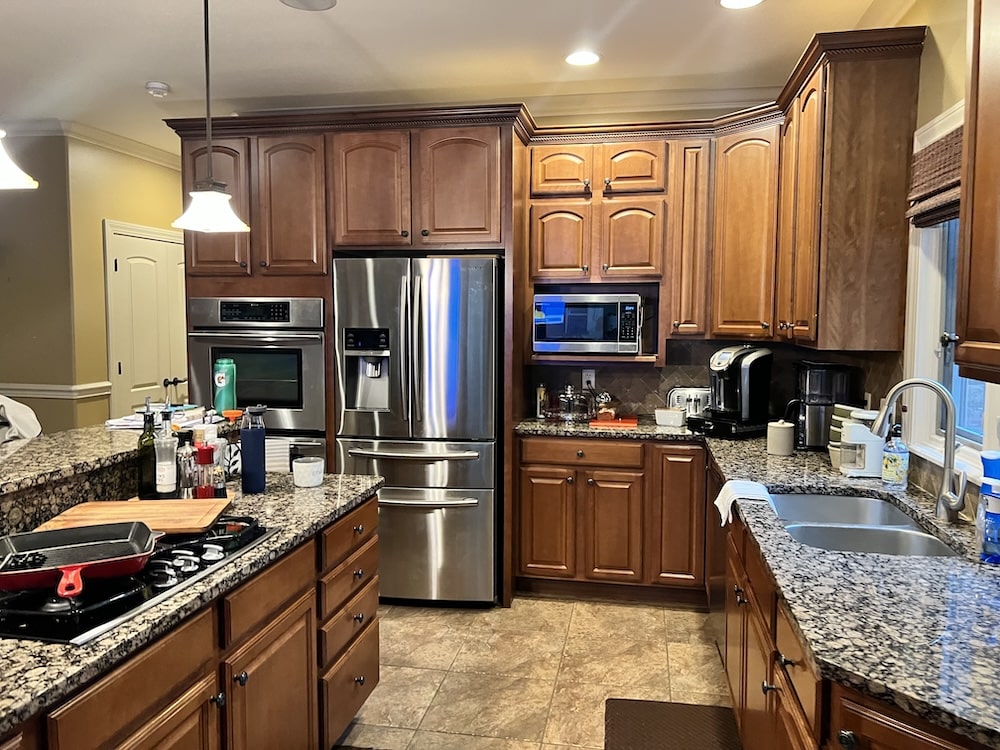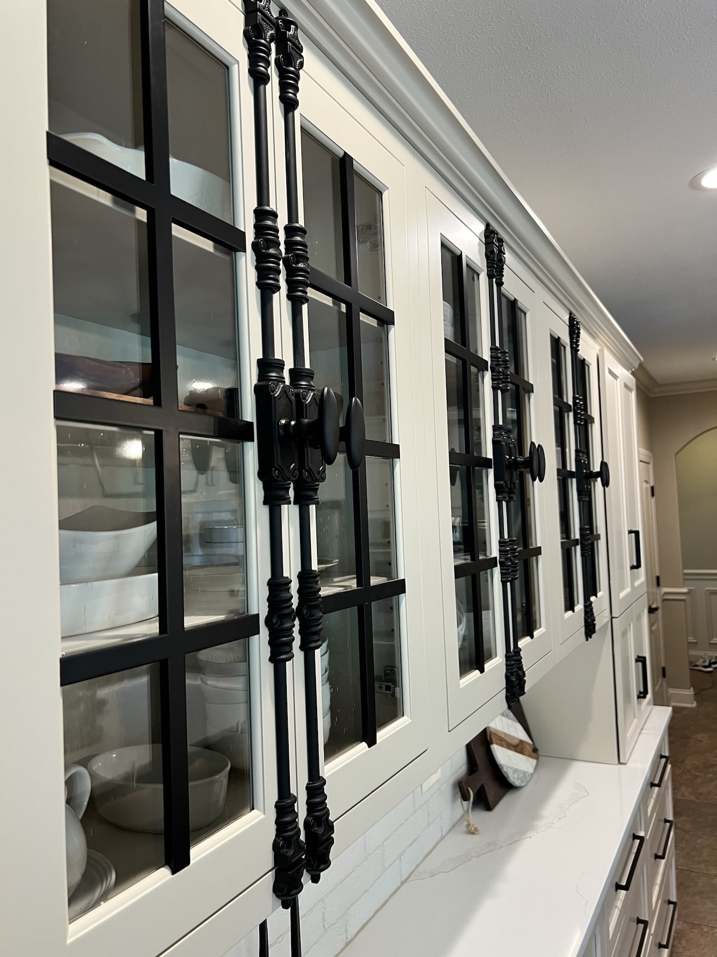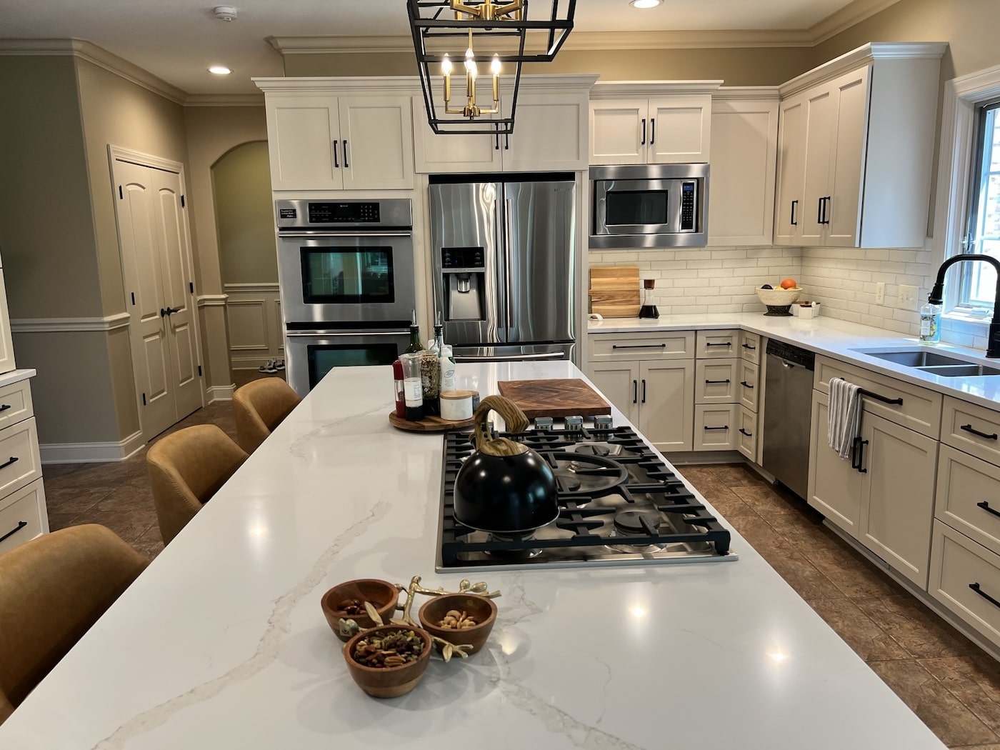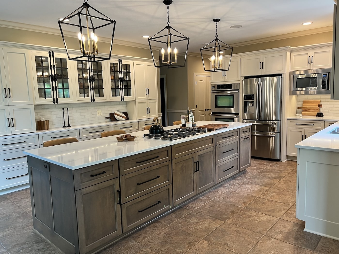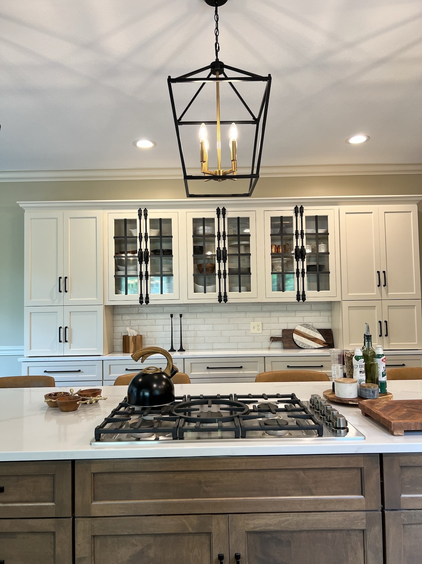 This two-toned semi-custom kitchen is sure to be a crowd pleaser. The large island in a wood tone adds warmth to the white perimeter. The double ovens and cook top are any chef’s dream. Black hardware, lighting fixtures, wall cabinets with mullion glass doors with cremone bolts draw the eye in this modern farmhouse kitchen.