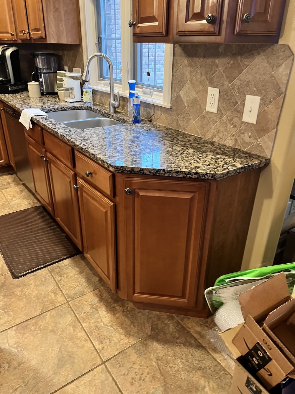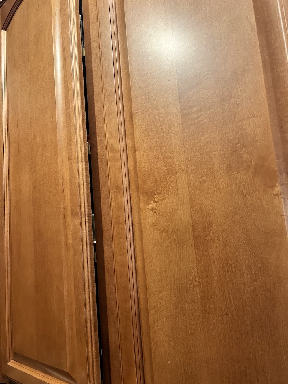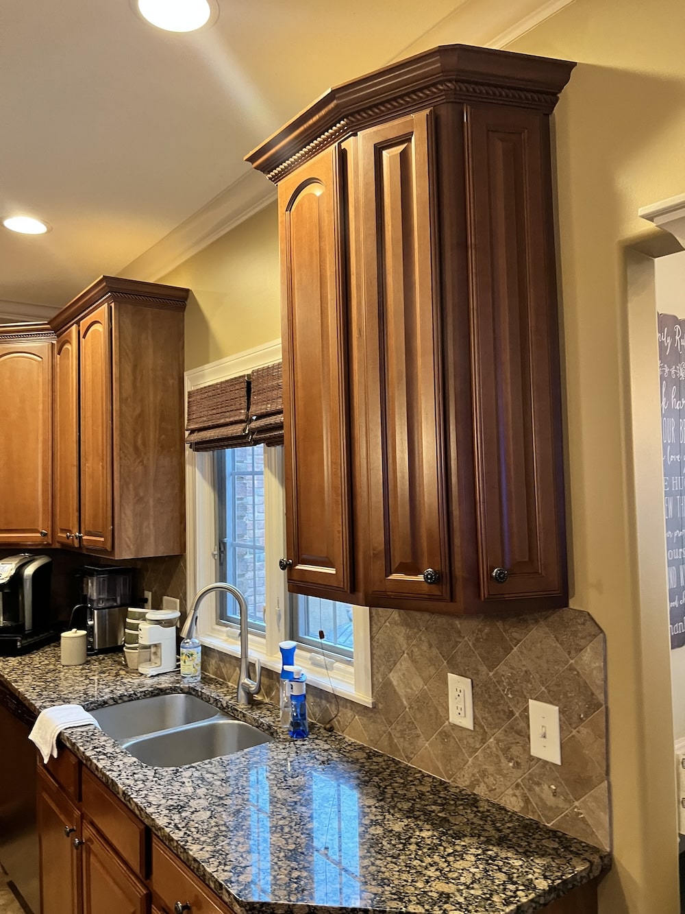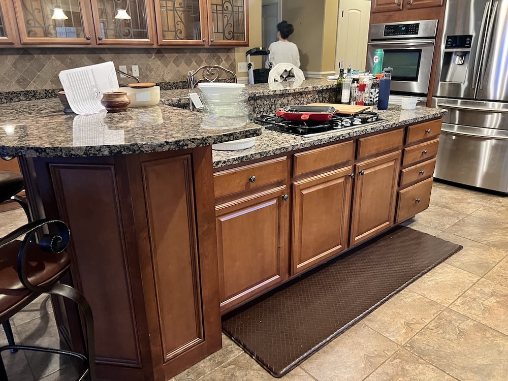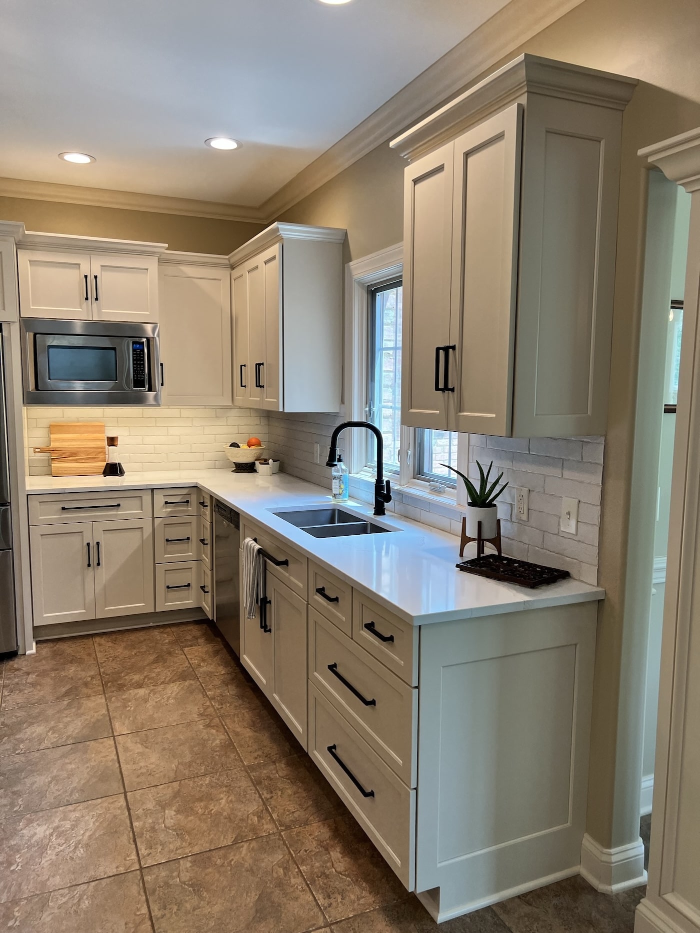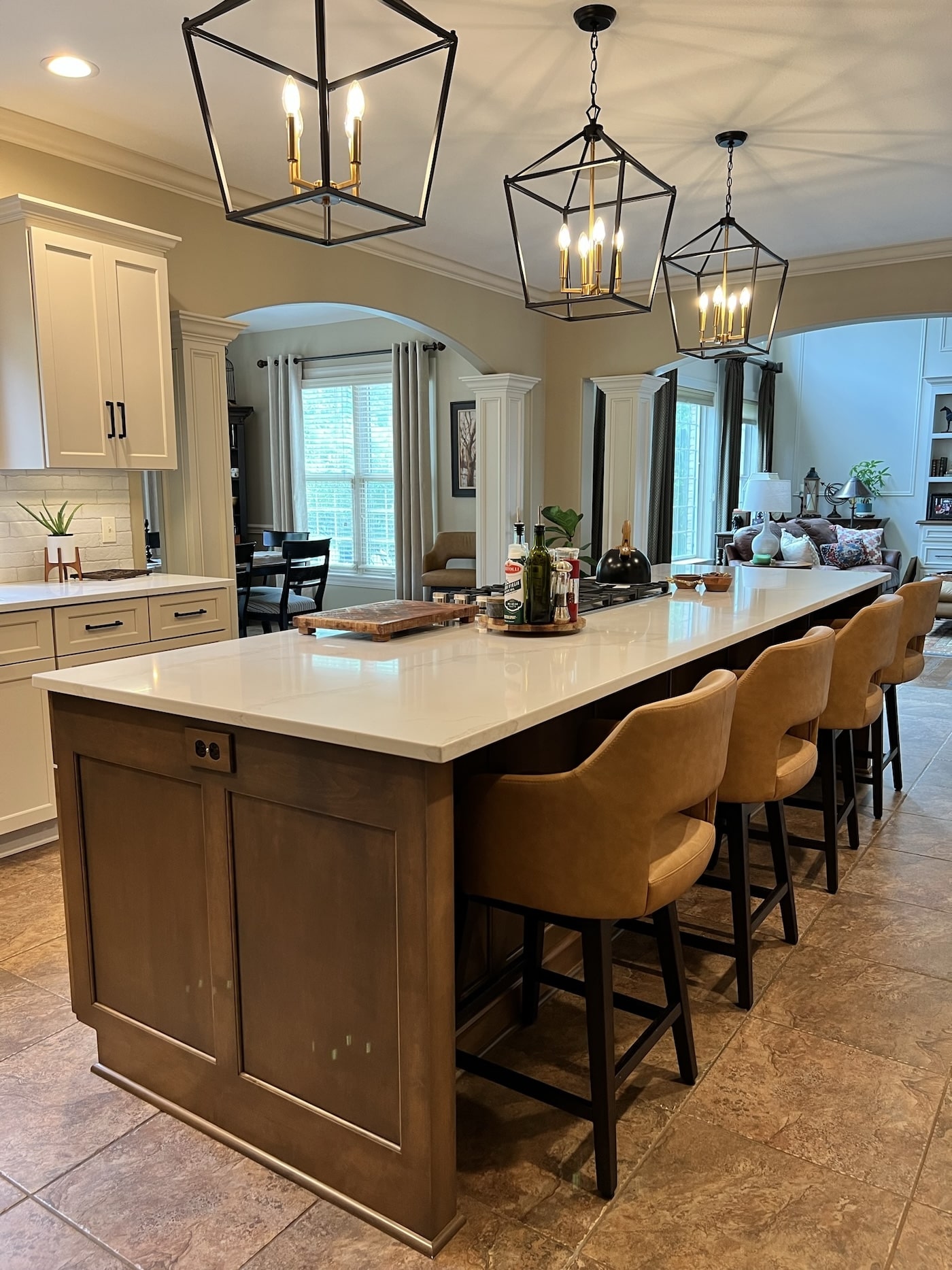 This two-toned semi-custom kitchen is sure to be a crowd pleaser. The large island in a wood tone adds warmth to the white perimeter. The double ovens and cook top are any chef’s dream. Black hardware, lighting fixtures, wall cabinets with mullion glass doors with cremone bolts draw the eye in this modern farmhouse kitchen.
